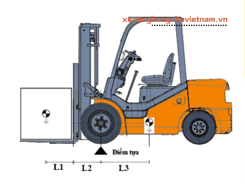 - P(Hàng hóa) x (L1 + L2) x hệ số an toàn = P(Xe nâng) x L3